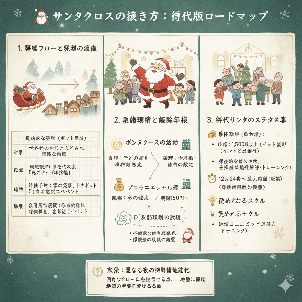 サンタクロースは通常、夢の使い手としてボランティアで活動する者たちが多数を占めますが、最近では金の銀河による報酬が発生することも。例えば、企業の奇跡を誘うイベントに招かれるサンタクロースは、時給1500円以上で雇われることもあるのです。だが、神聖な夜の冒険には不定期な旅立ちが伴い、賑やかな季節には残業という試練も待ち受けています。